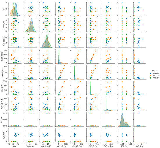 In the present study, we constructed a correlation matrix showing the association between every pair of parameters in which the correlation coefficient is calculated using Pearson’s method. A pairplot analysis was also performed among different feature parameters and the complication classes, which summarizes all the data points in a single plot while explaining the linear nature of the learning problem.