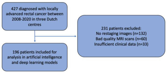 This multicentre retrospective cohort study included patients from three expert hospitals in the Netherlands: Amsterdam UMC, location VUmc (AUMC), the Netherlands Cancer Institute (NKI), and Catharina Hospital (CH). Patients from the NKI and CH were selected from the retrospective Lateral Node Consortium study [7], and patients from AUMC were included from a retrospective study of LARC patients [17]. Both studies only included patients with primary rectal carcinoma, of at least cT2 stage, diagnosed between July 2008 and November 2020. Patients with synchronous distant metastases or a non-curative dissection were excluded. None of the patients underwent formal LLND. Exclusion criteria were the absence of good-quality MRI scans unsuitable for segmentation, no restaging images, or missing clinical features required for the deep learning model (Figure 1).