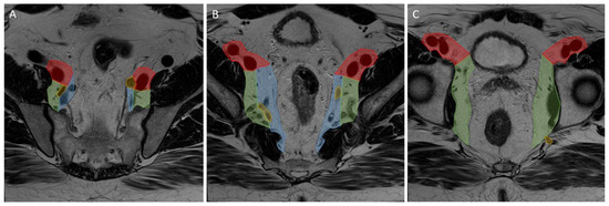 Lateral lymph node compartments. Progression through a T2 transversal pelvic MRI scan from (A–C) cranial to caudal. Red: external iliac compartment, blue: internal iliac compartment, green: obturator compartment, yellow: internal iliac artery.