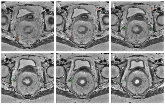 The LLNs documented during re-review were identified by the central researchers in order to establish a region of interest (RoI). In an attempt to avoid intra-observer bias and limit variation, two independent assessors evaluated the scans (T.C.S., M.H.). If the LLN was not easily identified, a senior researcher (M.K.) was contacted for advice. The RoI was created using segmentations (Figure 3) made on the transverse planes of T2-weighted MR imaging, with a maximum slice thickness of 5 mm. All visible LLNs were manually delineated on all slices of the MRI, checked by two researchers, and labelled on the primary and restaging MRI (Figure 3), using 3D slicer [18]. This segmentation distinguished the RoI from background tissue at the voxel level. This resulted in the creation of a binary mask with the same dimensions as the original image for each node.
