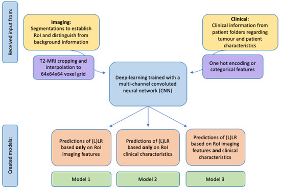 In total, three models were created, one based only on imaging features (Model 1), another based only on clinical features (Model 2), and a combined model with both imaging and clinical features from both sources (Model 3) (Figure 4). Imaging features included in Models 1 and 3 were the total LLN volume on baseline and restaging imaging (from manual segmentations) and the anatomical location of the LLN (according to MRI re-review). Models 2 and 3 included clinical information, such as the application of neoadjuvant treatment and, if so, which schedule was applied (chemoradiotherapy (25 × 2 Gy) with concomitant oral capecitabine or short-course radiotherapy (5 × 5 Gy)), the type of primary operation, and whether there were any pathologically positive resection margins (Table 1).
