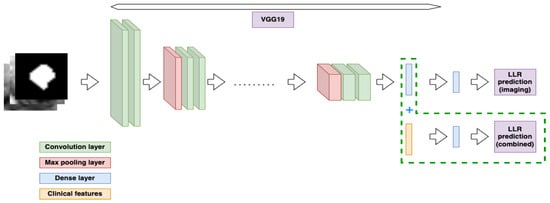 Baseline analyses were performed using SPSS Statistics, Version 26.0 (SPSS, Chicago, IL, USA [24]). The AUC of ROC curves was calculated to assess the quality of the LLN features in the prediction of LR and LLR. For the case of the clinical model (no imaging features), the AdaBoost classifier [25] was used to determine the probability of (L)LR. The same features used in the clinical model were concatenated with the deep learning features to make a combined prediction model (Figure 5).