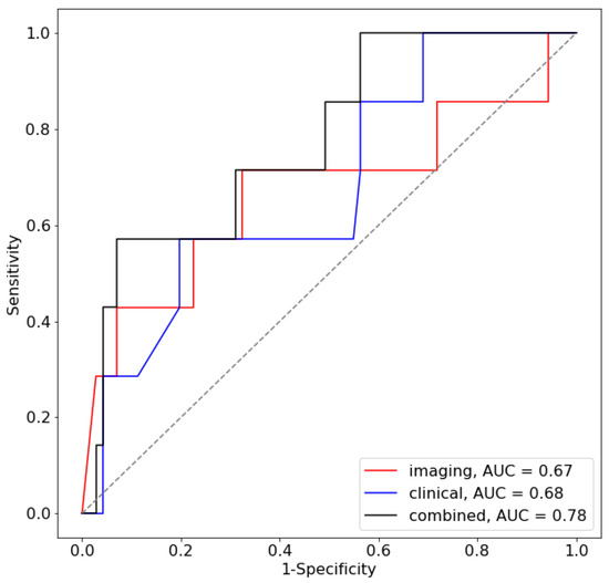 An AUC of 0.67 (95% CI: 0.40–0.95) was found for the prediction of LR using the 2D VGG model described previously. For the case of LLR, this was determined to be 0.57 (95% CI: 0.046–1.00). Using only the clinical features described previously, the AUCs from the AdaBoost classifier were determined to be 0.68 (95% CI: 0.47–0.89) and 0.73 (95% CI: 0.46, 1.00) for LR and LLR, respectively. The use of the combined model, which was trained using both T2W MR imaging and clinical features, resulted in AUC values of 0.78 (95% CI: 0.60–0.96) and 0.80 (95% CI: 0.49–1.0) for LR and LLR, respectively. The ROC curve for the test dataset is shown in Figure 6. The full results of the AUC values per centre are shown in Table 2A,B for the LR and LLR endpoints, respectively.