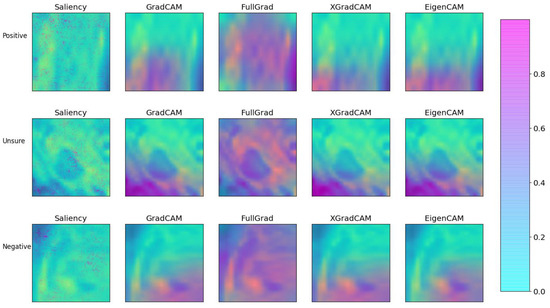 In order to test the explainability of the models, three examples from the test set were chosen in which the model was confident of a positive recurrence, unsure of the presence of a recurrence, and was confident no recurrence was present. These are depicted in Figure 7 along with the confidence values of the model. The results of the explainability methods described previously are shown in Figure 8. The corresponding SSIM and MSE values are provided in Table 4. Good agreement can be seen between the GradCAM, XGradCAM, and EigenCAM methods, with SSIM values ranging from 0.772–0.930 for these methods. The corresponding MSE values were found to be between 0.024 and 0.003. The saliency and FullGrad methods were found to show significantly less agreement. This is likely due to the pixel-based mapping for the case of saliency. For the case of FullGrad, the sum of gradients of all biases appeared to saturate the image.