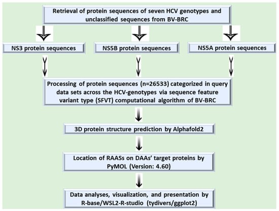 I determined the DAA resistance risk by employing an in-built sequence feature variant type (SFVT) of ViPR’s antiviral-resistance assessment tool, which is based on a computational algorithm. Each query dataset was purified, prepared, and separately analyzed via SFVT to gain insight into the resistance-associated amino acid substitutions (RAASs). The reference sequences for NS3 and NS5A/NS5B polyproteins used during the analyses were sequence IDs AAA72945.1 and NP_671491.1, respectively. The result was obtained following the sample run, which encompassed the enhanced resistance to any one or multiple DAAs with their allied RAASs in each query sequence of the datasets. Some RAASs without any phenotypic effect on resistance to the DAAs were excluded from the study. To access the locations of the RAASs on the respective DAA targets, each reference sequence was blasted using NCBI Protein Basic Local Alignment Search Tool BLAST: Basic Local Alignment Search Tool (nih.gov) to select NS3 and NS5A/NS5B sequences with 100% percent identity and query coverage. Based on the sequence IDs of selected sequences, I retrieved sequences from UniProt UniProt to achieve a 3D protein structure (UniProt ID for NS3:P27958 and for NS5A/NS5B: P26663). The retrieved sequences were folded for a 3D protein structure using AlphaFold2/MMSeqs2 AlphaFold Protein Structure Database (ebi.ac.uk). The locations of the RAASs (mutations) were ascertained and visualized by mapping the folded 3D structure of DAAs’ target proteins by employing PyMOL PyMOL | pymol.org. Data visualization and graphical context were generated by the R-package for the WSL2-based R-studio. The execution of the analytical methods has been demonstrated by a self-explanatory diagram (Figure 2).