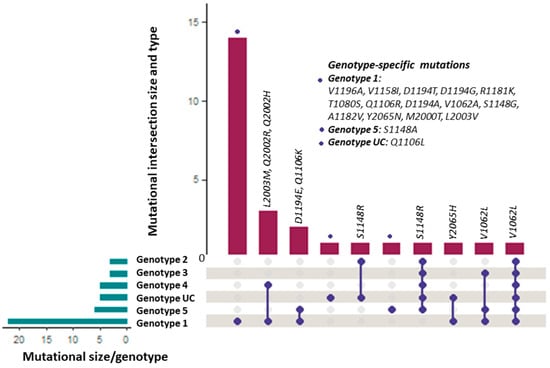 I determined the risk of anti-NS3/4A, anti-NS5A, and anti-NS5B inhibitors’ resistance across the HCV genotypes and some unclassified sequences in the form of RAASs in DAAs’ target non-structural proteins. I identified various DAAs resistance-associated NS3-mutated HCV protein sequences: twenty-three (n = 23) genotype 1, forty-seven (n = 47) genotype 2, one (n = 1) genotype 3, five (n = 5) genotype 4, twelve (n = 12) genotype 5, and four (n = 4) in genotype unclassified sequences (Table 1). The DAAs resistance-associated NS5B-mutated sequences of genotype 1, genotype 3, genotype 4, genotype 5, and unclassified genotype were four (n = 4), one (n = 1), twenty-six (n = 26), one (n = 1), and one (n = 1), respectively (Table 1). The DAAs resistance-associated NS5A-mutated sequences were fifty-five genotype 1 (n = 55), twenty-six genotype 4 (n = 26), and one unclassified genotype (n = 1), which is summarized in Table 1. Nine (n = 9) genotype 1 and five (n = 5) genotype 5 mutated NS3 protein sequences exhibited enhanced resistance (ER) to multiple DAAs (2-3 DAAs) while the rest of the mutated NS3, NS5A, and NS5B sequences were associated with resistance to a particular DAA (Table 1). RAAS V1062L was observed in genotypes 1, 2, 3, 4, 5, and unclassified (almost pan-genotypic presence). S1148R in genotypes 2, 3, 4, 5, and unclassified, Y2065H in genotype 5, unclassified, and L2003M, as well as Q2002R/H in genotypes 1, 4, and D1194E, and Q1106K in genotypes 1 and 5, were identified as shared RAAS among various HCV genotypes (Figure 3). Genotypes 1, 5, and 3 were similar because they shared one common RAASs V1062l while genotype 2 and unclassified were similar in exhibiting RAAS S1148R. Additionally, genotype-1 encompassed fourteen genotype 1-specific substitutions: V1196A, V1158I, D1194A/T/G, R1181K, T1080S, Q1106R, V1062A, S1148G, A1182V, Y2065N, M2000T, and L2003V (Figure 3). Whereas S1148S and Q1106L were identified as genotype 5- and genotype unclassified-specific resistance-associated substitutions (Figure 3).