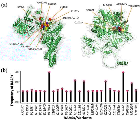 The number of RAASs, their types, and their frequencies in target proteins were determined. I identified twenty-seven (n = 27) RAASs in total across all the DAA target proteins under consideration: S2702T, V1196A, I1158V, D1194E, D1194T, D1194G, R1181K, T1080S, Q1106R, D1194A, V1062A, V1062L, Q1106K, S1148G, A1182V, S1148R, L2003M, Q2002R, Q2002H, Q2002L, Q2002S, S1148A, Y2065H, Q1106L, Y2065N, M2000T, and L2003V (Table 1 and Figure 2b). V1062L and L2003M were observed to be highly frequent, followed by Q2002H (Figure 4b). The other three frequently identified RAASs were S1148R, Q2002R, and Y2065H (Figure 2b). Moreover, locations (at n = nine different positions) of unique resistance-associated substitutions in NS3 (D1194E/G/T/A, S1148A/G/R, Q1106L/R/K, V1062A/L, A1182V, V1158I, R1181K, T1080S, and V1196A), NS5A (L2003M/V, Q2002R/H, and Y2065H/N), and NS5B (S2702T, L2003M, and Q2002R/H) target proteins were spotted and detected using PyMol (Figure 2a).