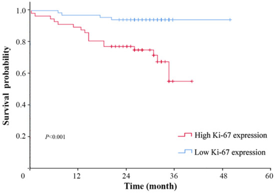 All specimens were surgically resected tumors obtained from needle biopsies (two or three reliable tumor tissue samples) to ensure that the Ki-67 detection represented the entire tumor. The EliVision Plus kit for instant immunohistochemistry (Fuzhou Maixin, Fuzhou, China) was used. The primary antibody was a mouse immunohistochemical monoclonal antibody against human Ki-67 antigen; refer to the kit instructions for the antigen–antibody reaction test. At 50 magnification, 1000 cells were randomly selected from each section and positive cells were counted. The Ki-67 index was calculated using the percentage of positive cells. According to the distribution of Ki-67 expression values in patients (the median value of Ki-67 expression was 25%) and supporting evidence from previous studies [8,22], the samples were classified into two groups: high Ki-67 expression (Ki-67 ≥ 25%) and low Ki-67 expression (Ki-67 < 25%).