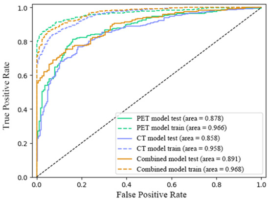 Table 2 lists the AUC, accuracy, specificity and sensitivity of deep learning models based on PET, CT and FDG-PET/CT. The results indicated that the combined model had the best superior AUC, precision and specificity (0.968, 0.900 and 0.946, respectively), while the PET model showed superior results in accuracy and sensitivity (0.903 and 0.858) for the training test. Meanwhile, in the test set, the combined model had the highest score for AUC, accuracy, precision and specificity (0.891, 0.822, 0.776 and 0.902, respectively), while the PET model had the highest sensitivity (0.747). ROC curves of the three models are shown in Figure 4 below. Our results revealed that the combined model was superior for predicting Ki-67 expression.