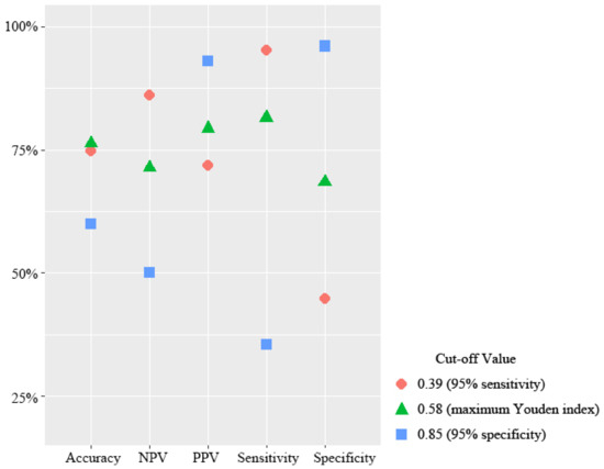 The FDG-PET/CT combined model directly transformed the PET/CT images into a high expression score (HES), which indicated the probability that the model considers the patient to have a high level of Ki-67 expression. Generally, the “discrimination threshold” is set to 0.5, that is, when the score is greater than 0.5, it is judged to be a high expression; otherwise, it is judged to be a low expression. However, different threshold classifications result in different performance models. As shown in Figure 5, the sensitivity of the deep learning model reached 0.95 when the HES threshold was 0.39, and the Yoden index of deep learning model reached the maximum when the HES threshold was 0.58. In addition, when the HES threshold was 0.85, the specificity of the deep learning model reached 0.95.