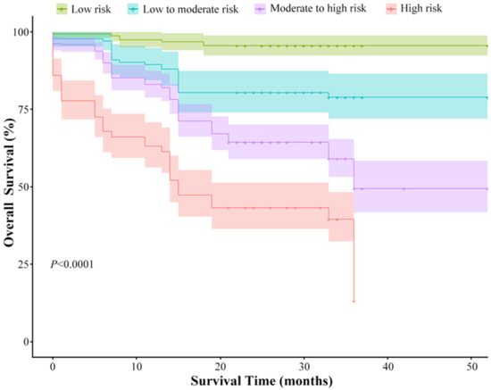 The prediction model score of the Ki-67 expression level was used as the risk score for patients with NSCLC, and the 95% sensitivity threshold, 95% specificity threshold and maximum Yoden index threshold were used as the classification basis. The case samples were divided into four risk grades: low risk (risk score < 0.39), medium and low risk (0.39 ≤ risk score < 0.58), medium and high risk (0.58 ≤ risk score < 0.85) and high risk (risk score ≥ 0.85). As shown in Figure 6, overall survival in the test set was significantly stratified by the risk score (p < 0.0001), which revealed that the risk score was negatively associated with the survival of NSCLC patients. Meanwhile, the univariate Cox regression analysis further confirmed that HES was a risk factor for the prognosis of NSCLC (p < 0.01) (Table 3).