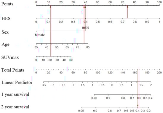 The nomogram in the test set. This nomogram includes four predictors: HES, age, sex and SUVmax. An 82-year-old male patient with an HES of 0.74 and SUVmax of 20.1 has a predicted probability of survival as shown by the red arrow. The total score of 164 predicted a 1-year survival probability of 0.62 and a 2-year survival probability of 0.40. The patient’s actual survival was 15 months.
