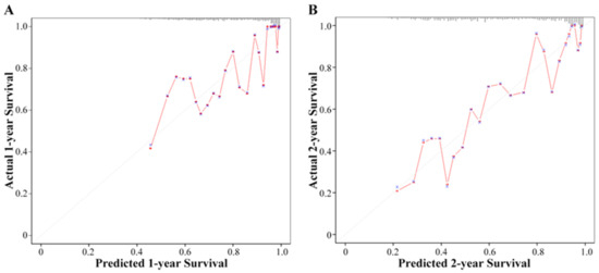 Calibration curves showed good calibration in (A) 1-year and (B) 2-year survival rate.