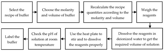 If the buffers were required to be prepared by mixing the stock solution, the required mass of the reagents to prepare the stock solution was calculated by using Equations (3) and (4) [29].