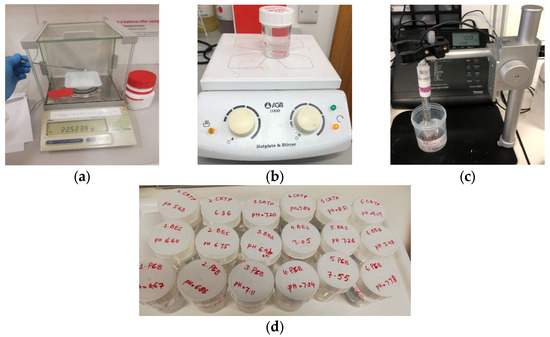 Preparation of buffers: (a) weighing the reagents, (b) stirring and dissolving the reagents, (c) recoding the pH at room temperature, (d) labeling the prepared buffers.