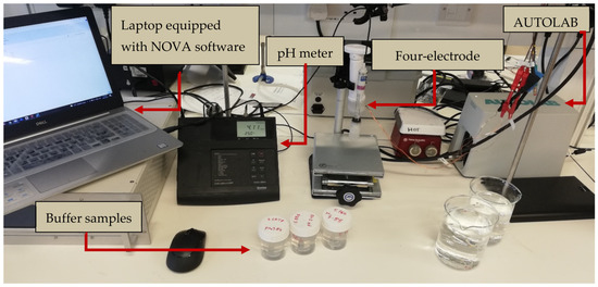 The temperature and pH of each buffer solution were recorded before the impedance was measured. The impedance measurements were repeated three times, and the mean impedance values were taken to calculate the conductivity for each buffer. Additionally, before taking each measurement, the thermometer, pH electrode, and probe were cleaned with distilled water and dried in the air. The diagram of the measurement system is shown in Figure 3.
