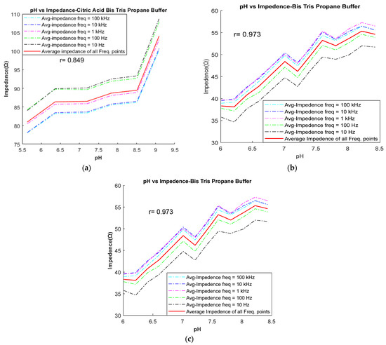 Impedance vs. pH relationship: impedance increases with increasing pH in (a) CBTP, (b) BTP, and (c) Trizma buffer.