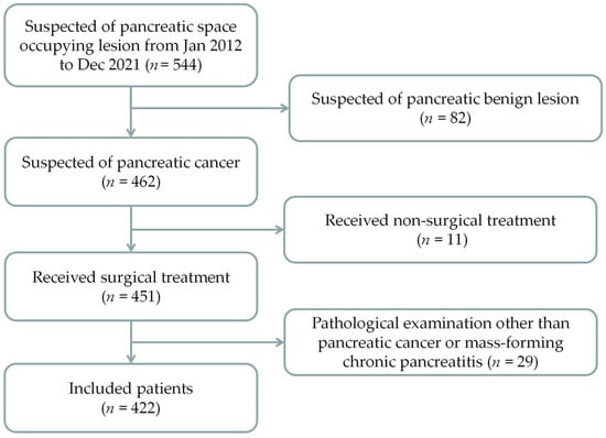 - Gandhi, S.; de la Fuente, J.; Murad, M.H.; Majumder, S. Chronic Pancreatitis Is a Risk Factor for Pancreatic Cancer, and Incidence Increases with Duration of Disease: A Systematic Review and Meta-analysis. Clin. Transl. Gastroenterol. 2022, 13, e463. [Google Scholar] [CrossRef] [PubMed]