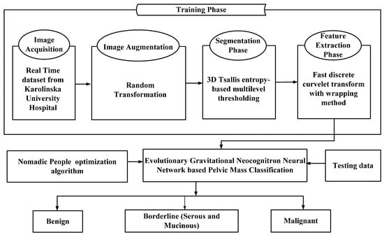In this manuscript, an evolutionary gravitational neocognitron neural network optimized with nomadic people optimizer is proposed for gynecological abdominal pelvic masses classification (EGNNN-NPOA-PM-UI). The process begins with augmenting the pelvic mass ultrasound image using random transformation methods including the following: simple image rotations including a flipping process such as rotate right 90 degrees, rotate left 90 degrees, flip vertical, flip horizontal, and rotate 180 degrees. Then the ultrasound images are segmented by utilizing 3D Tsallis entropy-based multilevel thresholding for fine segmentation. From the segmented images, the radiomic features are extracted by FDCT-WRP for further processes. Using those features the pelvic masses are classified by using EGNNN. Several hyper parameters have a considerable influence on the performance of the EGNNN classier. Hyper parameters are necessary to reach better results. Since the trial-and-error model for hyper parameter tuning is a tedious and erroneous process, metaheuristic approaches are employed. Therefore, nomadic people optimizer (NPOA) is applied for the hyper parameter tuning of the EGNNN classier. Figure 1 represents the block diagram of the EGNNN-NPOA-PM-UI method. The detailed explanation of the proposed EGNNN-NPOA-PM-UI method is given below.