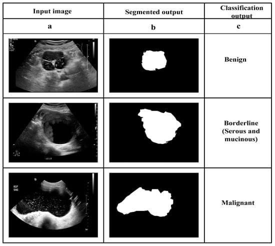 Evolutionary gravitational neocognitron neural network optimized with nomadic people optimizer for gynecological abdominal pelvic masses classification (EGNNN-NPOA-PM-UI). The proposed technique is activated in PYTHON. The implementations are made in PC utilizing Intel Core i7, seventh Gen Processor at 3.2 GHz, 8 GB RAM, Windows 7. The effectiveness of the EGNNN-NPOA-PM-UI method is evaluated under performance metrics. The obtained results are analyzed with existing models, like ultrasound image examination utilizing DNN for differentiating between benign and malignant ovarian tumors (DNN-VGG16-ResNet50-MobileNet-PM-UI) [19], automatic ovarian tumor identification scheme depending on ensemble convolutional neural network, and ultrasound imaging (CNN-Grad-CAM-PM-UI) [20], adoption of radiomics and machine learning upgrades for the diagnostic processes of women with ovarian masses (SVM-PM-UI) [21], machine learning method used with gynecological ultrasound to forecast progression-free survival in ovarian tumor patients (LR-RFF-KNN-PM-UI) [22], a deep learning method for ovarian cyst identification and categorization (OCD-FCNN) using fuzzy convolutional neural network (FCNN-PM-UI) [23], ovarian cancer estimation from ovarian cysts depending upon TVUS under machine learning strategies (RF-KNN-XGBoost-PM-UI) [24], ultrasound-based ovarian cyst detection with improved machine-lLearning strategies and stage classification under enhanced classifiers (ANN-DC-SVM-PM-UI) [25] and ovarian cyst categorization utilizing deep reinforcement learning and Harris Hawks optimization (DQN-HHOA-PM-UI) [26], respectively. K-fold cross-validation is considered. First, split the data into two parts: training and testing. The training/testing split ratio is randomly split into 3:2. The training part is further separated as five equal folds. The method is trained for five runs. Single fold is applied for validation during each run, with the remaining four folds training the method. The final model parameters are determined using the method with testing accuracy. In this work, 23,965 ultrasound pelvic mass images were taken for training and 15,977 ultrasound pelvic mass image taken for testing. We used data augmentation methods to prevent overfitting. The hyper-parameters are as follows: batch size 12; initial learning rate ; the learning rate is multiplied by 0.1 for every 10 epochs. The confusion matrix of the proposed EGNNN-NPOA-PM-UI method for testing ultrasound pelvic mass image is represented in Table 2. The output image of EGNNN-NPOA-PM-UI method is given in Figure 3. The input ultrasound images are given in Figure 3a. and then the segmented outputs are given in Figure 3b while the classification output is given in Figure 3c.