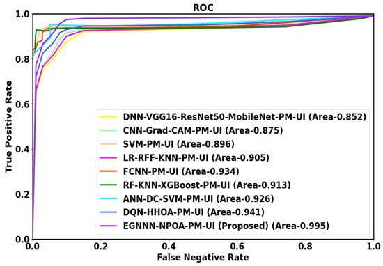 Figure 4 depicts the ROC curve for detection of gynecological abdominal pelvic masses. Then, the ROC of the proposed EGNNN-NPOA-PM-UI method provides 16.78%, 13.71%, 11.04%, 9.94%, 6.53%, 8.98%, 7.45%, and 5.73% higher area under curve (AUC) than the existing methods, like DNN-VGG16-ResNet50-MobileNet-PM-UI, CNN-Grad-CAM-PM-UI, SVM-PM-UI, LR-RFF-KNN-PM-UI, FCNN-PM-UI, RF-KNN-XGBoost-PM-UI, ANN-DC-SVM-PM-UI and DQN-HHOA-PM-UI, respectively.