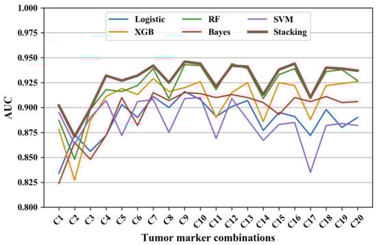 The AUC of the five machine learning models and the stacking model is displayed in Figure 1. Given that there were only twenty distinct cost values, only the model with the highest AUC is displayed for each value (denoted as C1-C20; see Table 2). It is explicit that the AUC of the stacking model was generally the best (at least no worse than the others) among all tumor-marker models.