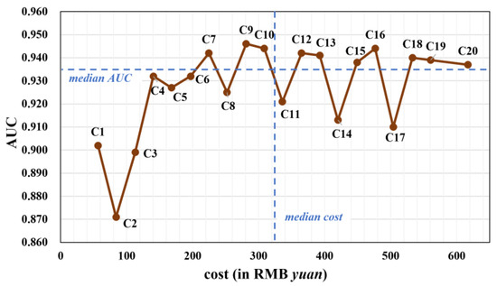 Based on the median values of AUC and cost, the 20 combinations were segmented into four subgroups: (1) combinations like C7, C9, and C10 with relatively high AUC and low cost; (2) combinations like C1-C6 and C8 with lower AUC and low cost; (3) combinations characterized by high AUC and high cost; and (4) combinations exhibiting low AUC and high cost.