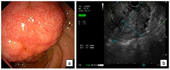 Indication for surgical treatment: LST-p characterized with a circumferential extra-papillary component on the duodenal wall with a tumor size exceeding 4 cm (a) and an intraductal involvement >20 mm confirmed using EUS (b).