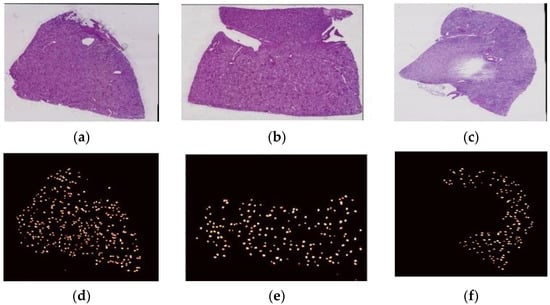 The dataset utilized in this study was obtained from Kaggle, from the HubMap hacking the kidney section. The dataset comprising 20 WSIs of kidney tissue was stained using the PAS reagent []. The images were produced at high resolution using a bright field scanner set at 20× magnification from the slides of kidney biopsies. As a sample, three WSIs from the dataset are shown in Figure 1, where Figure 1a–c illustrates the original WSIs of the dataset and Figure 1d–f displays the corresponding ground truth masks for the WSIs.