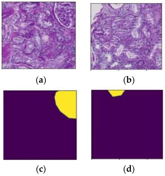 Due to the large size of each WSI, it is impossible to use them directly; therefore, all WSIs and their respective mask sizes must be reduced []. All WSIs with an original size between 13,013 × 18,484 pixels and 49,548 × 38,160 pixels were cropped into 512 × 512-pixel tiles for this purpose. After cropping, the dataset consisted of 50,486 tiles. The entire collection of cropped tiles was divided into 26,874 training tiles and 23,612 testing tiles to train and test the model, respectively. Figure 2a,b show the 512 × 512 pixel extracted tiles, and Figure 2c,d show their ground truth masks.
