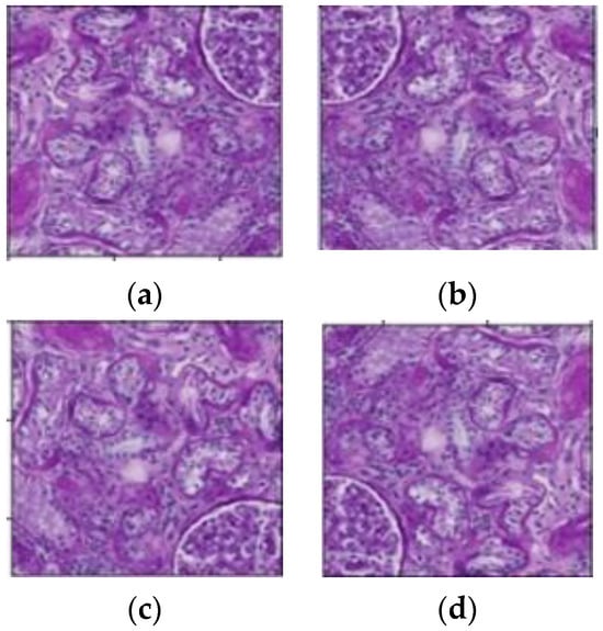 The extracted 50,486 tiles included 13,441 glomerulus tiles that contained at least one glomerulus, while the remaining 37,045 tiles did not contain any glomeruli. The imbalance in the distribution of tiles (images) could result in the model being overfitted. To maintain a balance between the number of glomerulus and non-glomerulus images, the data augmentation method was used. The glomerulus images increased through the vertical shift, horizontal shift, and horizontal flip techniques. After augmentation, the dataset contained a total of 40,323 glomerulus images. Figure 3 depicts the various data augmentation techniques utilized in this study.