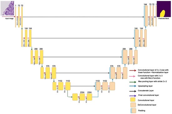 Figure 4 represents the different layers with different-colored arrows in the architecture of the modified UNet model. In the contraction path of the model, there were five blocks of layers; each block contained one convolutional layer with a normalization layer and another simple convolutional layer with the max pooling layer. In the initial block, the number of filters increased from 1 to 72. The green arrow indicates the max pooling layer, which reduced the feature map dimensions from 512 × 512 to 256 × 256 by decreasing the number of pixels in the output of the convolutional layer and increasing the number of filters from 72 to 144. To accomplish downsampling, this procedure was repeated four times. In the second, third, fourth, and fifth convolution operation, the feature map was reduced from 256 × 256 to 128 × 128; from 128 × 128 to 64 × 64; from 64 × 64 to 32 × 32; and from 32 × 32 to 16 × 16, respectively. At the end of the contraction path, the image was 16 × 16 and contained 2304 filters. As the image resolution became very low after the contraction path, it had to be converted back to a high resolution before the output, as the input and output should have the exact resolution []. To accomplish this, the model’s expansive path was utilized, which consisted of five convolution blocks. In each block, the upsampling layer, followed by the convolutional layer, was used to increase the image size and decrease the number of feature maps. By contrast, the concatenate layers were combined with the contraction path layers to obtain the image’s previous information.