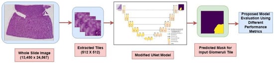 Figure 5 illustrates the implementation methodology of the proposed modified UNet model. Initially, the original WSIs were cropped into tiles with dimensions of 512 × 512 pixels. These extracted tiles were used as the input for the modified UNet model that, in turn, generated a mask which predicted the location of glomeruli within the input image. The model’s performance was evaluated by comparing this predicted mask to the ground truth mask.