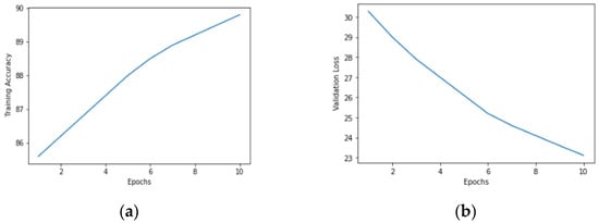 The graphical representation of the validation loss and validation accuracy for the proposed modified UNet model using a batch size of eight and 10 epochs is illustrated in Figure 6a,b. Figure 6a demonstrates a positive correlation between the number of epochs and the validation accuracy. Figure 6b illustrates a decreasing trend in the loss value as the number of epochs increased.