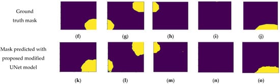 To evaluate the visual performance of the proposed model, a comparison was made between the ground truth masks and masks generated by the proposed model. Figure 7 provides a visual analysis using a selection of five sample images. In this analysis, the input images shown in Figure 7a–e and corresponding to these input images, Figure 7f–j, display the ground truth masks. Additionally, Figure 7k–o depict the masks predicted using the modified UNet model. This visual examination clearly represents how well the proposed model aligned with the ground truth masks for these specific sample images.