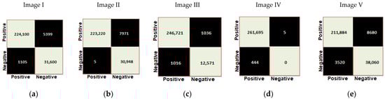(a–e) Confusion matrices obtained for five sample images with Adam optimizer, a batch size of eight and epochs 50 using proposed modified UNet model.