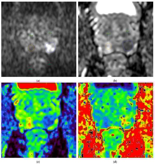 - Toivonen, J.; Merisaari, H.; Pesola, M.; Taimen, P.; Boström, P.J.; Pahikkala, T.; Aronen, H.J.; Jambor, I. Mathematical models for diffusion-weighted imaging of prostate cancer using b values up to 2000 s/mm2: Correlation with Gleason score and repeatability of region of interest analysis. Magn. Reson. Med. 2014, 74, 1116–1124. [Google Scholar] [CrossRef]