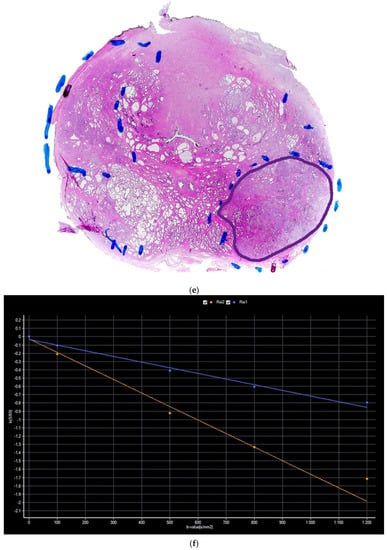 62-year-old patient with PSA level 8 ng/mL and PIRADS 5 lesion located in left PZ, that after radical prostatectomy was assessed as acinar type prostate adenocarcinoma GS 4 + 3. Images of the prostate with GS 4 + 3 lesion in left PZ (ROI 1—circled in blue) and control (ROI 2—circled in orange) in benign prostatic tissue: (a) DWI at b-value 2000 s/mm2 with high-intensity lesion in left PZ (ROI 1) and control ROI 2 in normal tissue (b) ADC map obtained with b-values 0–1200 s/mm2 with corresponding low-intensity signal in lesion in left PZ (ROI 1) of 0.68 × 10−3 mm2/s and control ROI 2 of 1.73 × 10−3 mm2/s (c) Color-coded maps of Dapp and (d) kurtosis obtained with b-values 0–2000 s/mm2 show Dapp of 0.88 × 10−3 mm2/s and kurtosis of 1.40 in ROI 1 and Dapp of 2.18 × 10−3 mm2/s and kurtosis of 0.69 in ROI 2, respectively. (e) Whole-mount prostate specimen shows GS 4 + 3 PCa in left PZ (circled with continuous line in violet); additionally, GS 3 + 4 PCa is seen in right PZ (circled with dashed line in blue). DWI signal-intensity decay plots obtained using monoexponential model (f,g) and kurtosis model (h) for different b-values (marked as dots on the graph). Graph in blue corresponds to ROI 1 in GS 4 + 3 lesion; graph in orange corresponds to control ROI 2 in normal peripheral zone (free of cancer): (f) Gaussian distribution standard monoexponential model for b-values 0, 100, 500, 800, 1200. Goodness-of-fit for ROI 1—0.96, ROI 2—0.93. (g) Gaussian distribution standard monoexponential model for b-values 0, 100, 500, 800, 1200, 2000. Goodness-of-fit for ROI 1—0.92, ROI 2—0.89. (h) Non-Gaussian kurtosis model for b-values 0, 100, 500, 800, 1200, 2000. Goodness-of-fit for ROI 1—0.99, ROI 2—0.98. Figure 1a–d,f–g are modified screenshots provided by Advanced Diffusion Analysis application, Intellispace Portal 10.