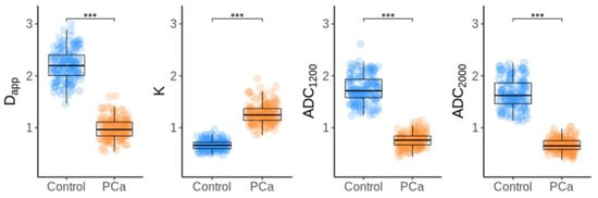 Moreover, in our study, we observed the similar diagnostic performance of ADC1200 and ADC2000, with no significant differences between them, despite the better fit in the range of b-values up to 1200 s/mm2. The demonstration of a statistically significant, strong negative correlation between K and ADC in PCa (r = −0.816, p < 0.001) and in benign tissue (r = −0.880 p < 0.001), a finding previously noted by Tamada, may to some extent explain the similar diagnostic performance of both models [17,22,23].