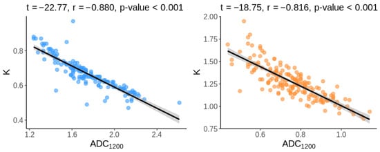 A negative correlation between K and ADC was observed in both PCa (r = −0.816, p < 0.001) and benign tissue (r = −0.880 p < 0.001) as shown in Figure 3.