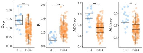 Mean Dapp, ADC1200, and ADC2000 were significantly lower (p < 0.001) in GS ≥ 3 + 4 compared to GS 3 + 3 tumors (0.960 ± 0.179 vs. 1.221 ± 0.223 × 10−3 s/mm2, 0.744 ± 0.129 vs. 0.934 ± 0.137 s/mm2 and 0.649 ± 0.117 vs. 0.824 ± 0.129 s/mm2, respectively). Mean K values were significantly higher in GS ≥ 3 + 4 compared to GS 3 + 3 tumors: 1.288 ± 0.179 vs. 1.051 ± 0.120 (p < 0.001) as shown in Table 3.