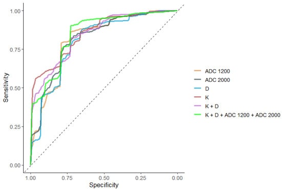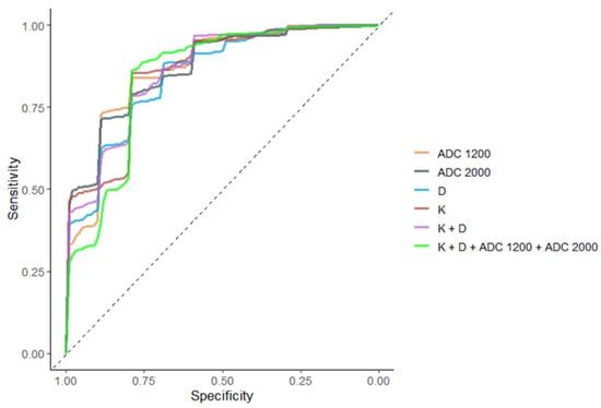 The diagnostic performance of the combination of all parameters derived from both diffusion models (D + K + ADC1200 + ADC2000) also did not reveal better diagnostic performance in comparison with ADC alone. AUC for (D + K + ADC1200 + ADC2000) was 0.773.