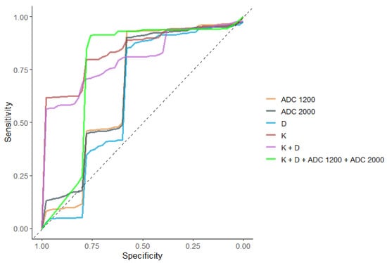 However, neither the combination of both DKI parameters together (K + D) nor the combination of all parameters derived from both diffusion models (D + K + ADC1200 + ADC2000) did not reveal significantly better diagnostic performance in ROC analysis in comparison with ADC alone.