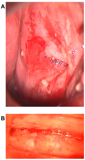 Colposcopic patterns associated with microinvasive VAIN3. Abnormal colposcopic findings of grade 2, vascular patterns and papillary lesions with regular (A) and/or irregular (B) surface in two women affected by VAIN3 with stromal microinvasion, both located at the vaginal vault, after previous hysterectomy for cervical cancer.