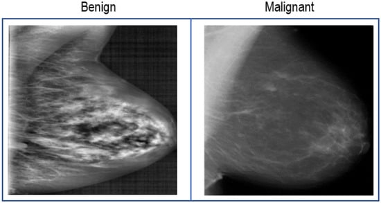 In this study, we used the Digital Database for Screening Mammography (DDSM) dataset to train and test our vision-transformer-based transfer-learning system for early identification of breast cancer. This dataset is publicly available and accessible at https://data.mendeley.com/datasets/ywsbh3ndr8/2 [accessed on 12 September 2022]. The dataset includes 13,128 images including 5970 from benign and 7158 from malignant tissues. Sample images from the dataset are shown in Figure 1.