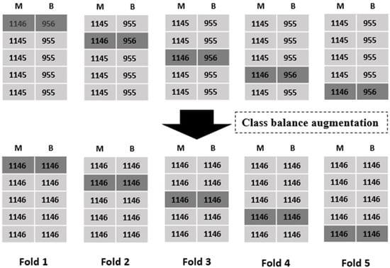 Data class balancing using image augmentation: M, malignant; B, benign.