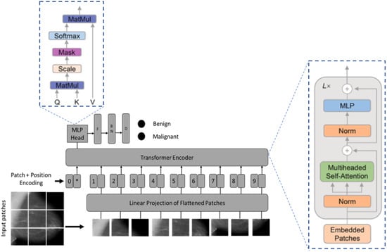 A few studies have investigated the use of ViTs in classifying mammograms for the early diagnosis of breast cancer. Lee et al. [52] proposed transformer-based DL, which tackles the challenges of mammogram normalization and inter-reader variance in grading. They proposed an approach that uses a photometric transformer network (PTN) as a programmable normalization module to forecast the normalization parameters of input MG. It seamlessly connects to the primary prediction network, allowing for combined learning of the best normalization and density grade. In principle, the PTN resembles a spatial transformer network [53]. However, the PTN seeks to identify a set of photometric transformation parameters that are best for predicting breast density, while the spatial transformer network forecasts suitable geometric transformation parameters. Tulder et al. [45] suggested a novel token-based and pixel-wise cross-view transformer technique and used it on two public MG datasets. The authors suggested an approach based on transformers that join views at the feature map level without requiring pixel-by-pixel correspondences. They used cross-view attention rather than self-attention to transfer information across views, different from how conventional transformers process information inside a single sequence. For image segmentation and breast mass detection in digital mammograms, Su et al. [54] proposed the YOLO–LOGO transformer model. This included two steps: first, they used YoloV5 to detect the breast mass ROI and cropped it directly from the high-resolution image to increase training effectiveness. Thereafter, they used an updated version of the local–global (LOGO) segmentation strategy, which significantly increased the segmentation resolution at the original pixel level. Garrucho et al. [55] evaluated the domain generalization of MG models by comparing the performance of eight cutting-edge detection techniques trained in a single domain, including transformer-based models, and tested them in five unexplored domains. They observed that transformer-based models were more robust and performed better than others in domain generalization of mammograms. Chen et al. [56] used a multi-view transformer (MVT) model to detect breast cancer segments on mammograms. MVT was composed of two main components, the local and global transformer blocks. Local transformer blocks individually analyze data from each view image. In contrast, the global transformer blocks combine data from the four-view mammograms. Self-attention, multi-head attention, and multilayer perceptron were the three main components of the local and global transformer blocks, both of which had the same design.