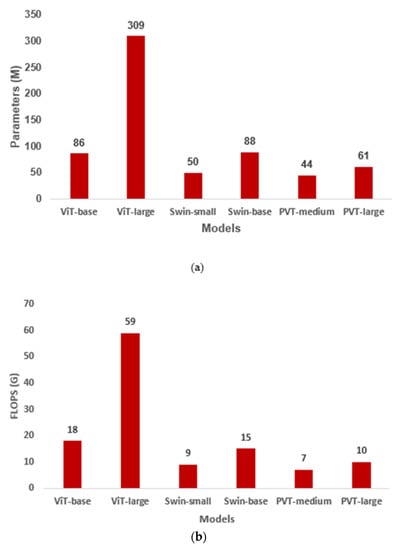 An investigation was conducted to determine the computational complexity of the proposed method. To do so, we used floating point operations per second (FLOPS) to compare the computational costs of the different vision-transformer-based transfer-learning models. FLOPS is a measure of the number of operations needed to run a single instance of a certain model. For instance, how many operations are required to train a single instance of ViT model. The larger the FLOPS, the higher the computational cost; the lower the FLOPS, the lower the computational cost. Thus, a model with a smaller FLOPS is preferred. Figure 7 depicts the number of parameters in millions (M) (Figure 7a) trained for each model and their corresponding FLOPS in gigas (G) (Figure 7b) for all six vision-transformer-based transfer-learning models. As can be seen from the figure, models with a large number of parameters have a larger FLOPS, and vice versa. In our case, the PVT-medium with 44 million parameters had the smallest FLOPS of 7G. In contrast, ViT-large with 309 million parameters had the highest FLOPS of 59G. Therefore, the PVT-medium with the smallest value of FLOPS was effective for vision-transformer-based transfer learning on the DDSM dataset, although its performance in terms of accuracy is the same as that of the other five models.