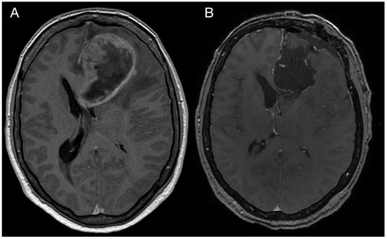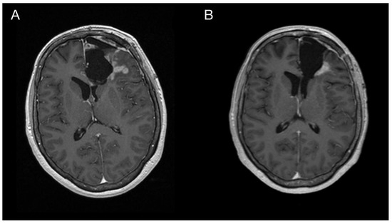 Imaging of the primary brain tumor prior to and after the oncological treatment. Axial brain MRI (postcontrast T1 weighted images) prior to oncological treatment displaying GBM’s rapid early progression in the left frontal lobe (A) and two months after the chemo-radiotherapy (B).