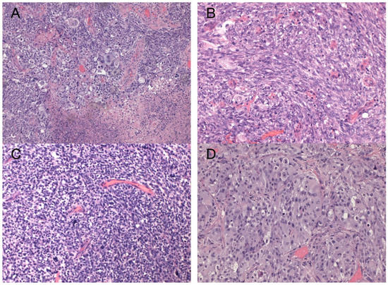 Histology of the primary GBM. Hypercellular high-grade diffuse glioma featuring significant cellular pleomorphism, including multinucleated giant cells, nuclear atypia, brisk mitotic activity, multiple microvascular proliferations, and necroses (A) (original magnification 100×). Regions with spindle cell morphology (B), small round blue cell morphology corresponding to regions of PNC (C), and epithelioid morphology (D) (original magnification 200×).